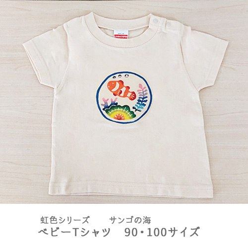紅型ベビーTシャツ 虹色シリーズ じゅごんの海、さんごの海、くじら 90サイズ、100サイズ 出産祝いや贈り物に 沖縄の伝統工芸紅型柄の個性的なベビーTシャツ