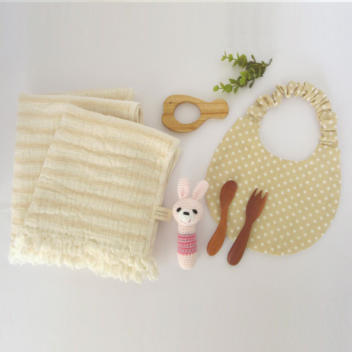 出産祝いで人気の「オーガニックタオル」大、小の2枚、初めてにぎる木製カトラリー、着脱が簡単な「すっぽりスタイ」、人気の歯固め、小さな手で持ちやすい手作りあみぐるみをセットにしたギフトです。