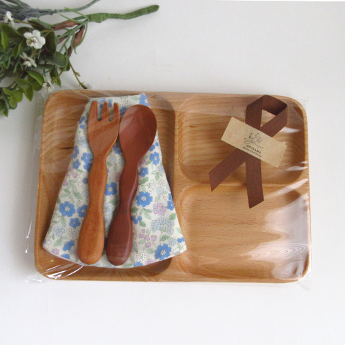 天然木の温もりが感じられるランチプレート、持ちやすさにこだわったフォーク&スプーン、そしてお食事にはかかせないスタイの4点セットです。