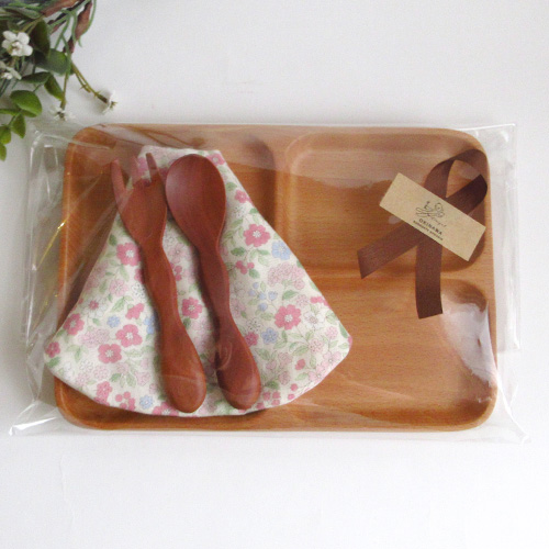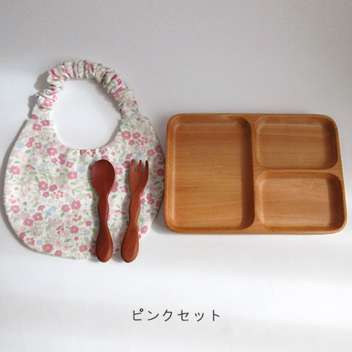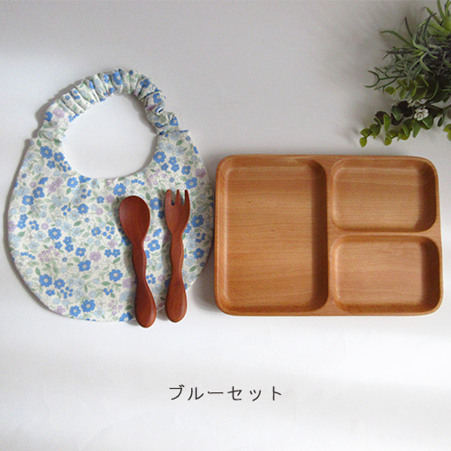 パクパクお食事デビュー4点セット|木のランチプレート・もこもこスプーン&フォーク・花柄スタイ|リボンラッピング付き