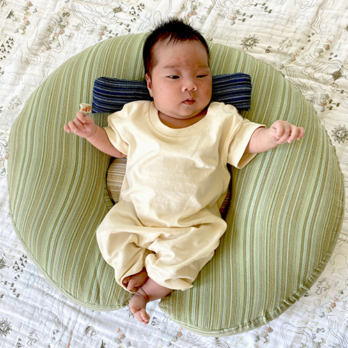 赤ちゃんの首元のカーブに添うように作った首まくらは、赤ちゃんの首と頭を優しく支えてくれます。